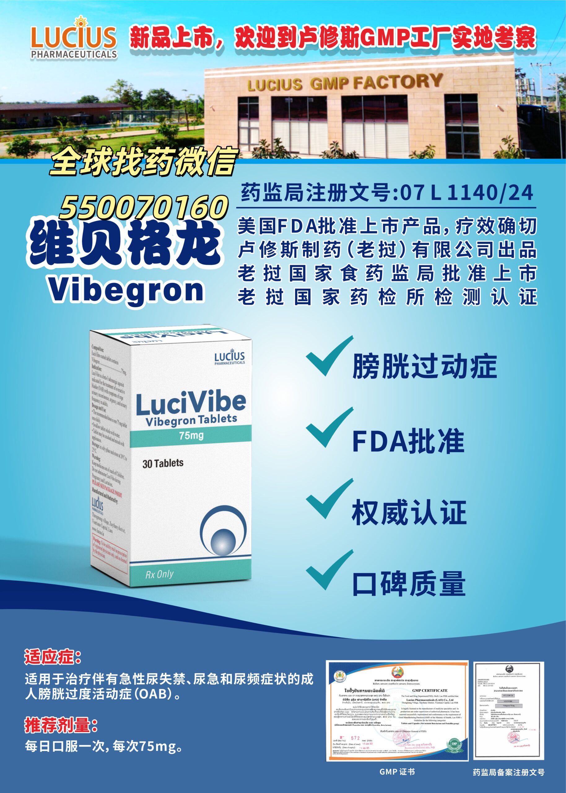 - 定制化 OAB 服务:部分老挝药企提供 “OAB 症状评估 + 用药指导” 一站式服务,协助患者对接国内泌尿外科专家(如北京协和医院、上海仁济医院),明确诊断与治疗方案;同时支持 “小批量试用装订购”(如 2 周剂量:75mg×14 片),方便患者在正式用药前评估耐受性(如是否出现高血压、头痛),避免药品浪费;针对老年患者,还可提供药品服用提醒服务(如定制每日服药卡片)。