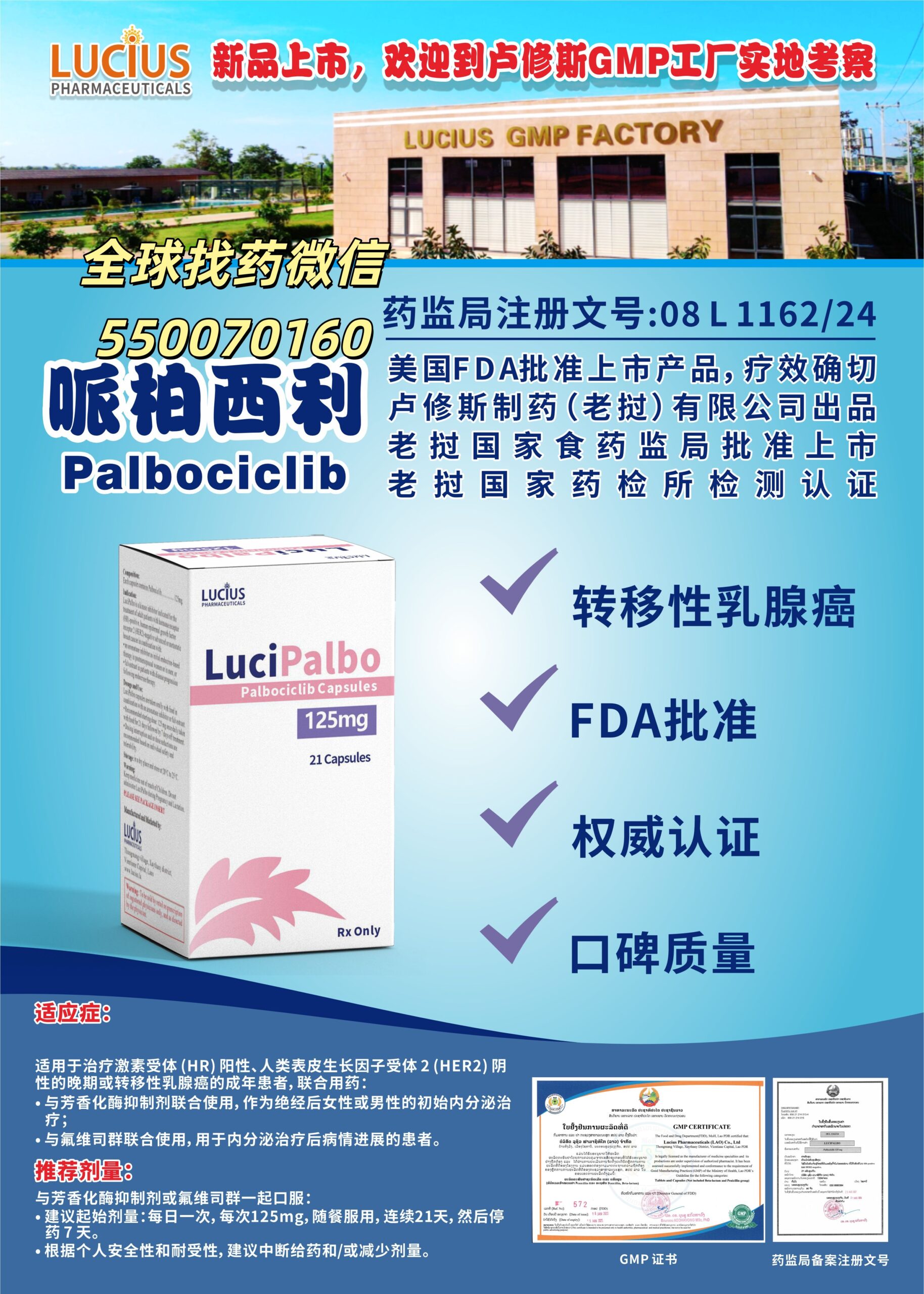 - 价格极致亲民:老挝仿制药价格仅为原研药的 1/7-1/10,以 125mg 规格为例,月均费用 2000-3500 元,年治疗费用降至 2.4-4.2 万元,仅为印度仿制药价格的 70%-80%;对无医保报销或经济困难的耐药患者,可节省 80% 以上费用,大幅降低用药门槛,让更多晚期乳腺癌患者能接受规范靶向治疗,避免因费用放弃治疗。